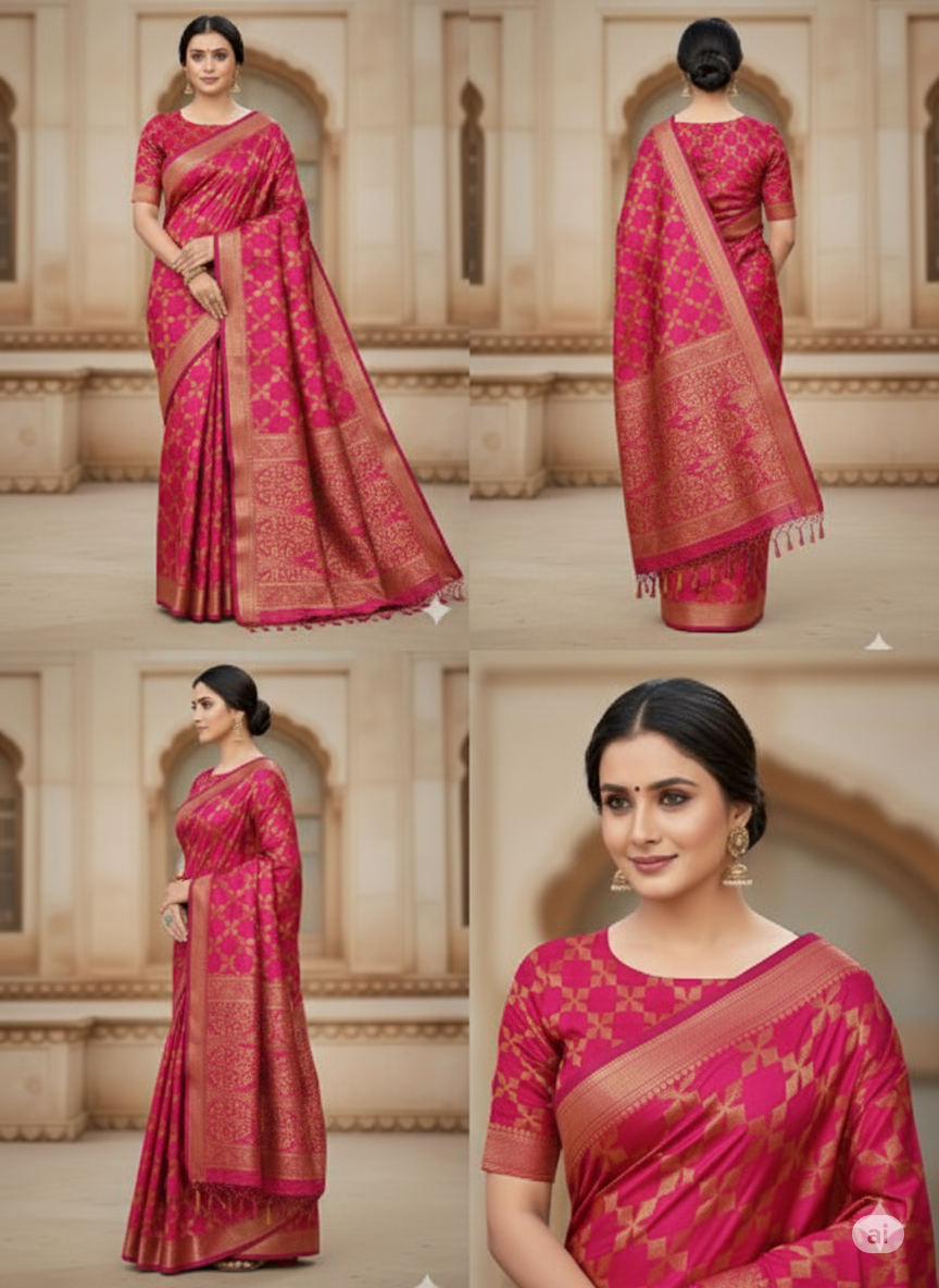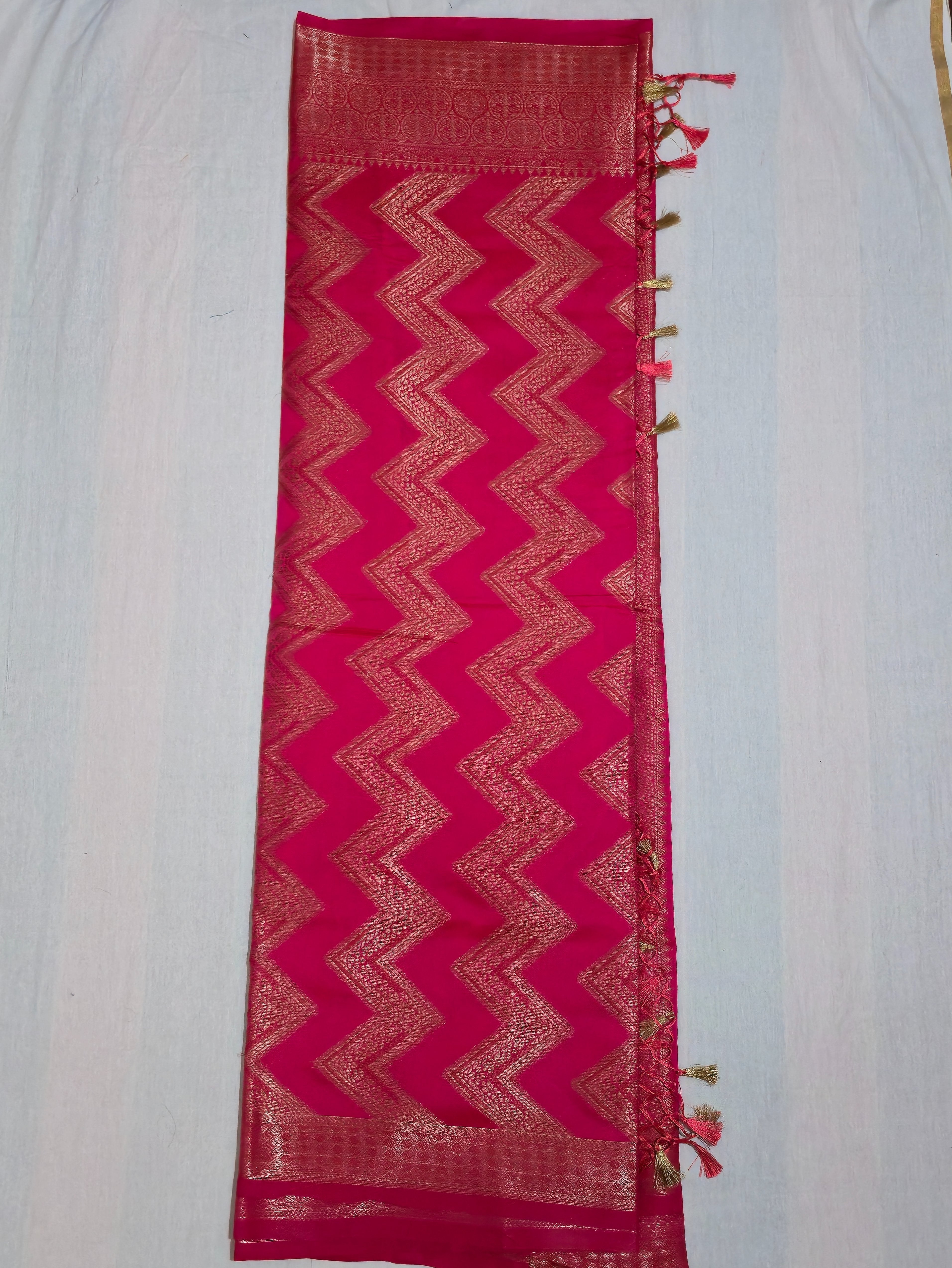 The vibrant Bright Pink hue adds a joyful vibrancy to traditional aesthetics, making it perfect for festive celebrations, special occasions, or any moment you wish to feel effortlessly radiant. Soft to the touch and luxuriously fluid, this saree reflects the timeless charm of Banaras while complementing contemporary sensibilities.