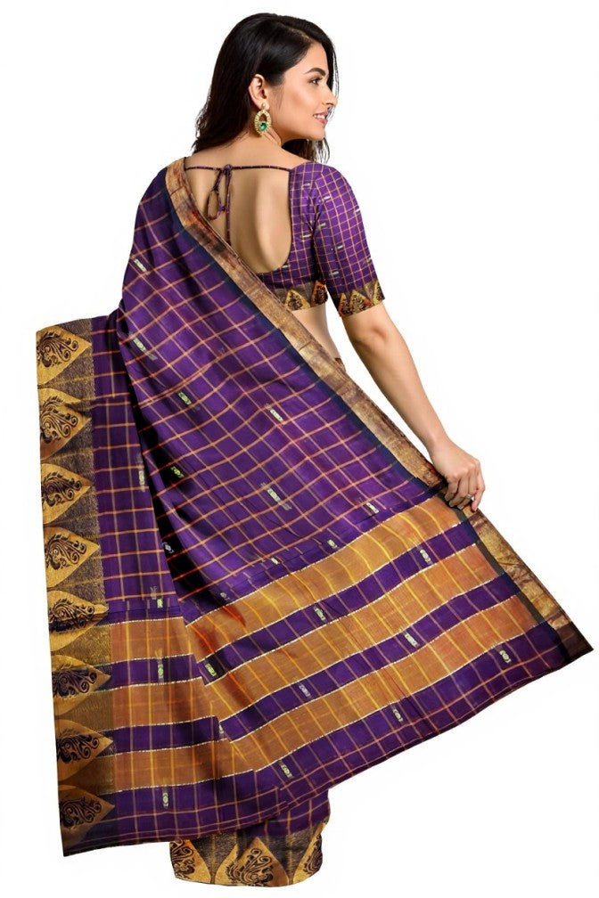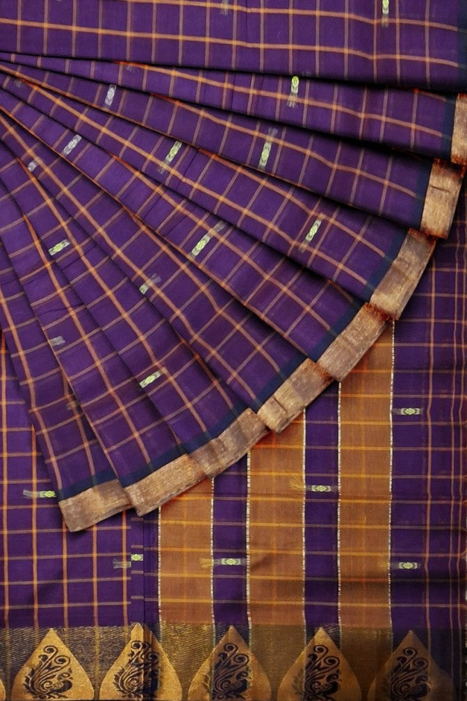 Exuding regal charm, this Handloom Cotton Chettinad Sinduchecks Butta saree in Purple is a graceful blend of traditional craft and contemporary allure. Woven with classic sindu checks and elegant butta motifs on traditional looms, it reflects the rich textile heritage of Chettinad. The saturated purple tone adds depth and sophistication, making it ideal for festivals, celebrations, and refined everyday style.